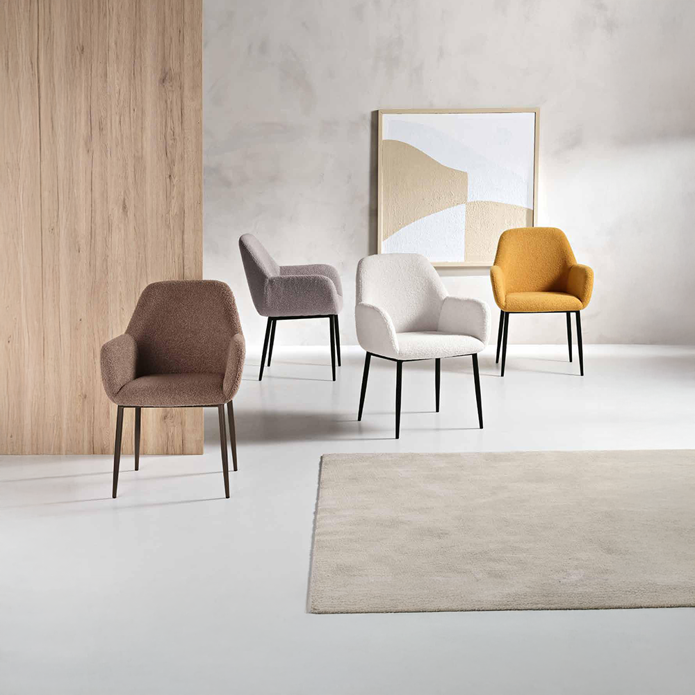 Il rivestimento in bouclé écru di schienale e seduta, morbido al tatto, crea un piacevole contrasto con la struttura metallica.