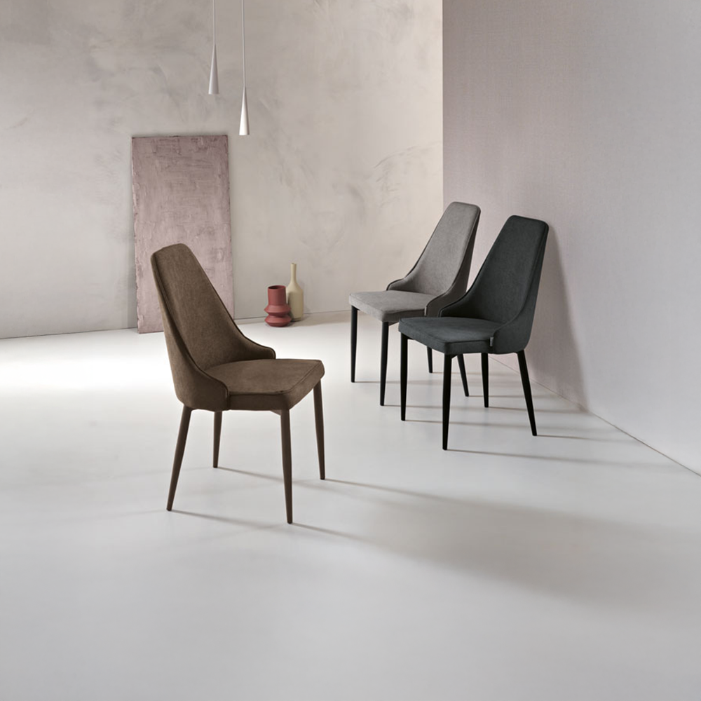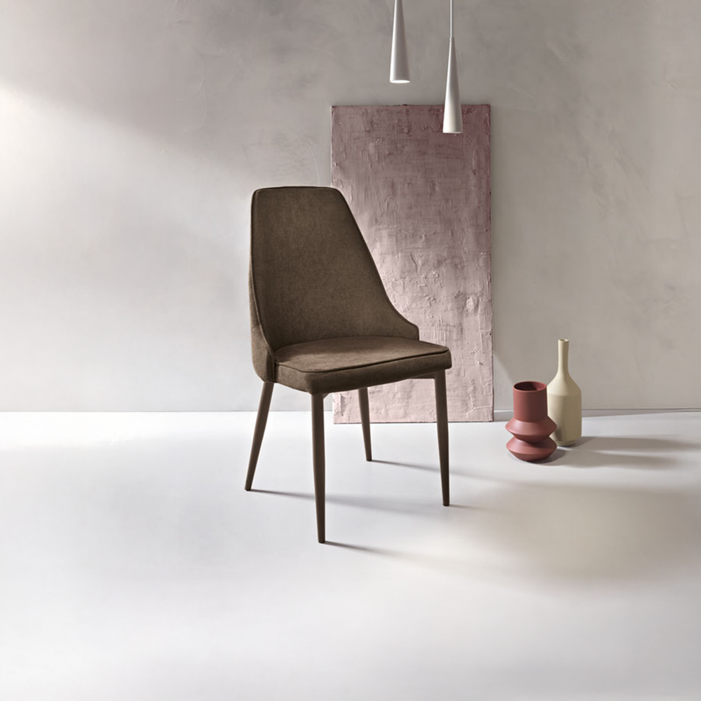 La sedia Nelli รจ caratterizzata da una seduta imbottita rivestita in morbido tessuto e da una solida struttura in metallo verniciato.