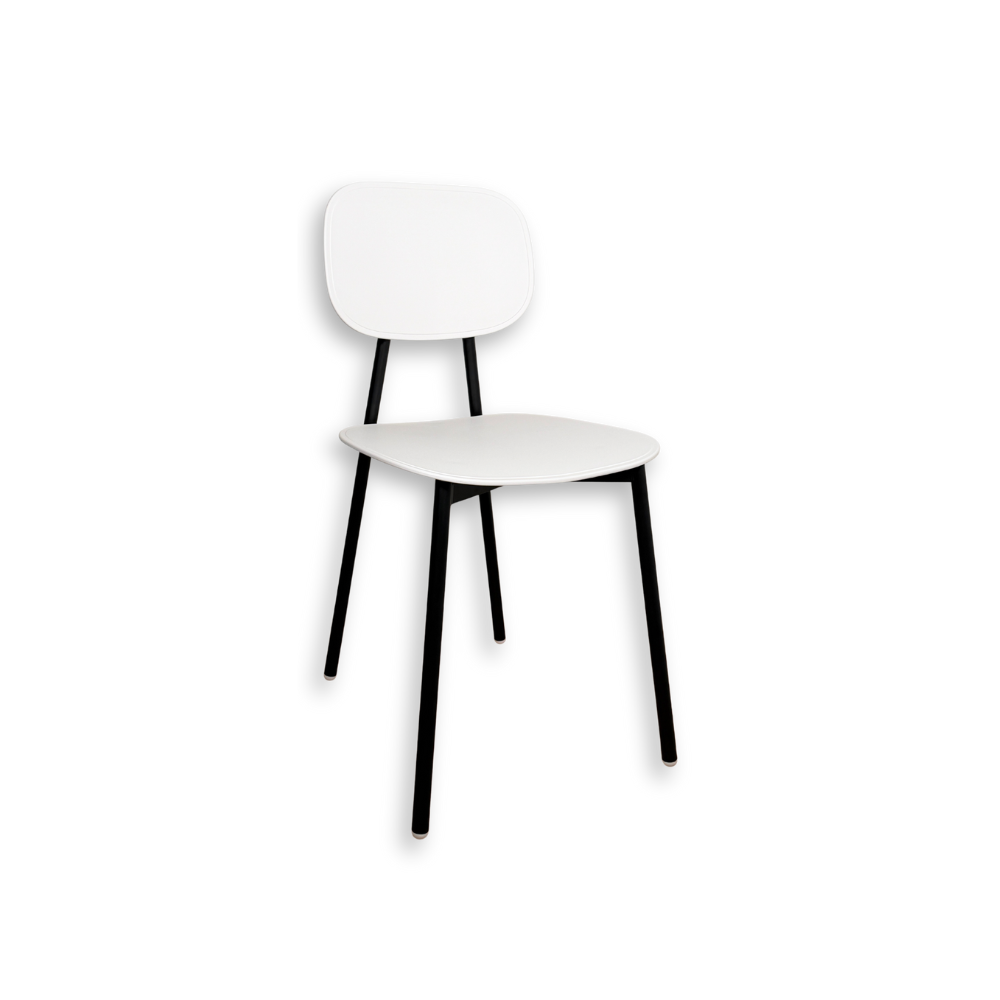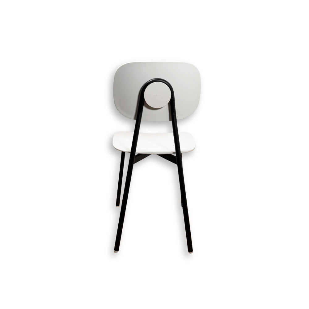 La sedia Tata Young 4ย ha una seduta in polipropilene bianco, materiale leggero e facile da pulire, perfetto per ambienti dinamici e per un uso quotidiano, e una struttura in metallo verniciato nero opaco.