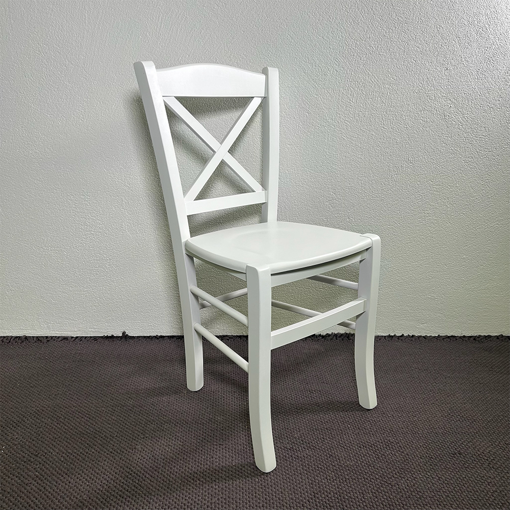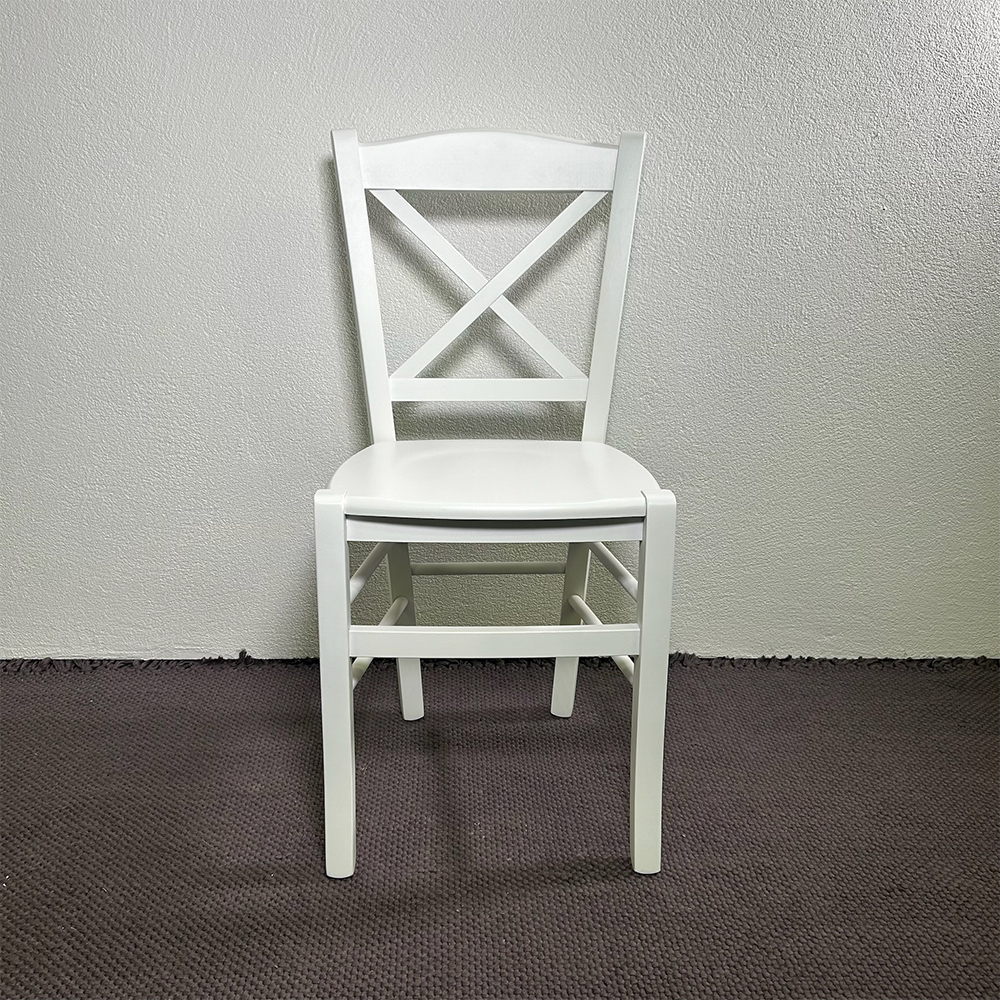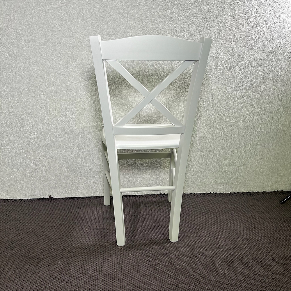 Realizzata in legno bianco, presenta uno schienale caratterizzato da un motivo a โXโ che richiama le atmosfere tradizionali di campagna.