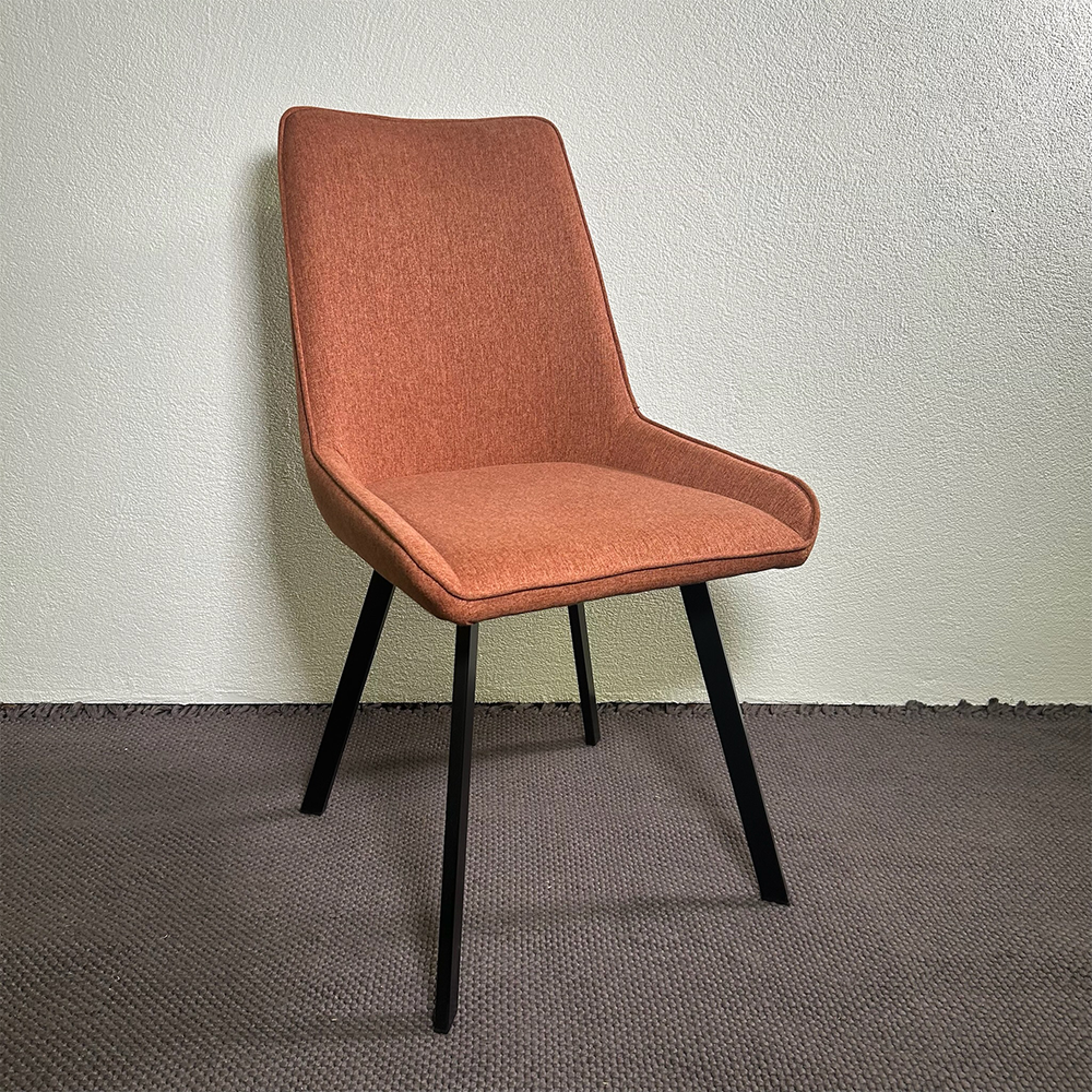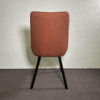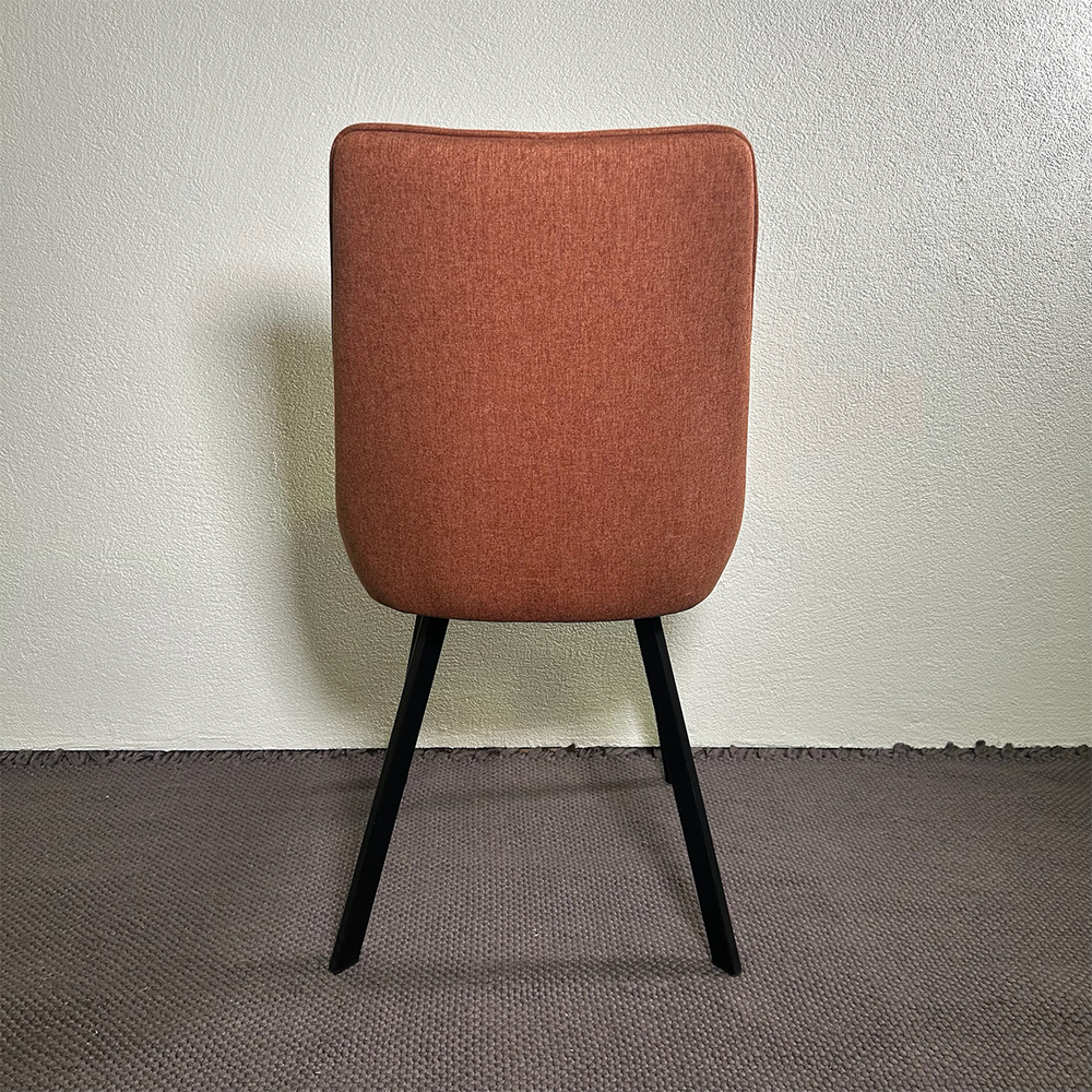 Il set include quattro sedie con struttura in metallo verniciato nero, solida e durevole, e una seduta imbottita rivestita in tessuto microfibra color ruggine, morbido al tatto e facile da mantenere.