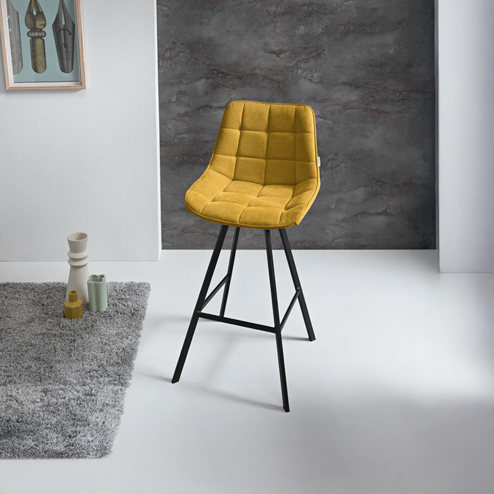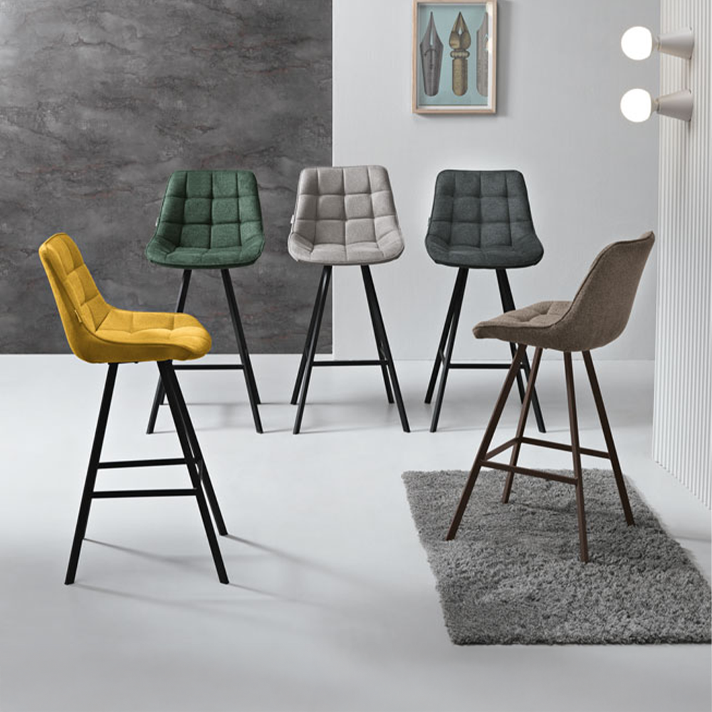 Sgabello con struttura in metallo verniciato e seduta imbottita rivestita in tessuto trapuntato.