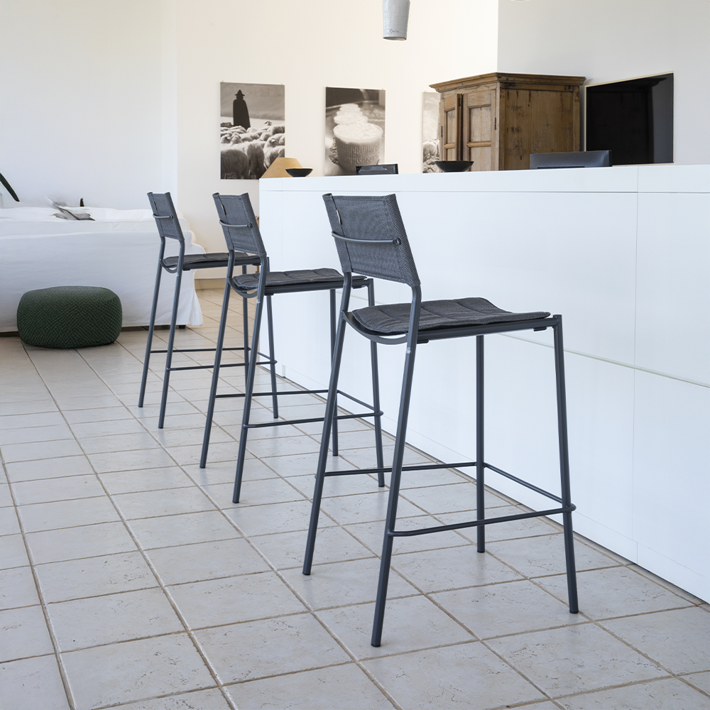 Sgabello outdoor con struttura in acciaio zincato e schienale in Batyline.