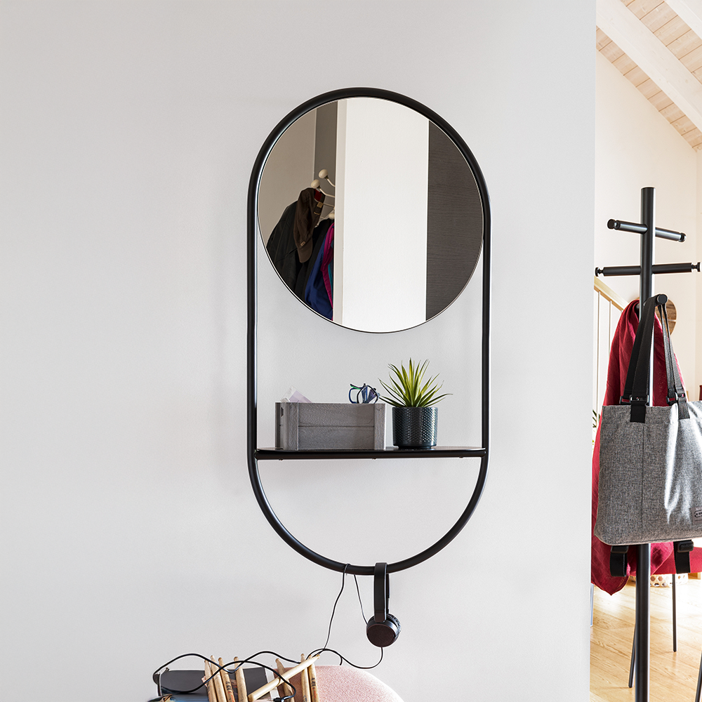 La struttura in metallo nero opaco disegna una cornice essenziale e integra una pratica mensola portaoggetti, ideale per appoggiare piccoli accessori, profumi o oggetti dโuso quotidiano.
