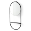 Specchiera rotonda con struttura e mensola portaoggetti in metallo nero opaco.