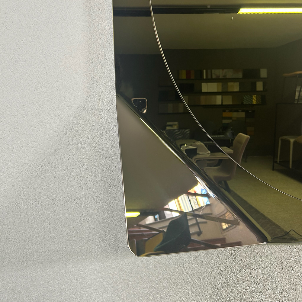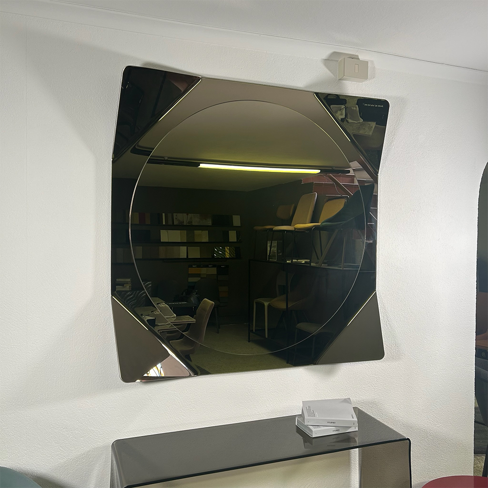 La sua struttura quadrata, realizzata interamente in vetro curvato fumé, crea un effetto di profondità e riflessi delicati che donano luminosità e stile alla parete.