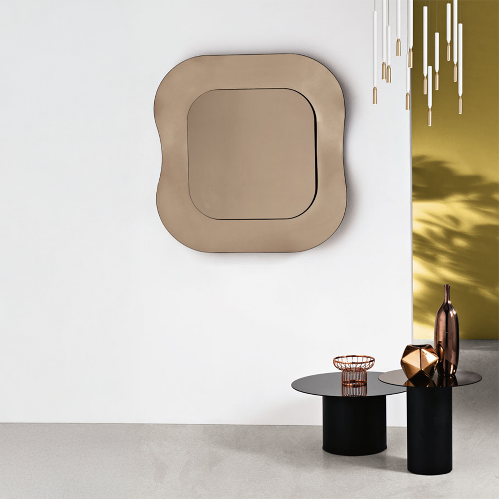 Specchio quadrato fumé o bronzo con cornice in vetro fuso mosso.