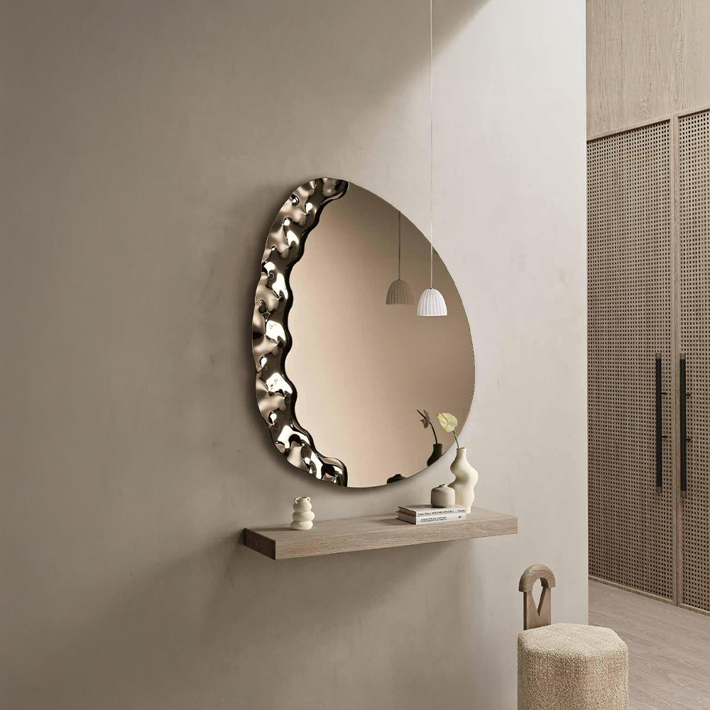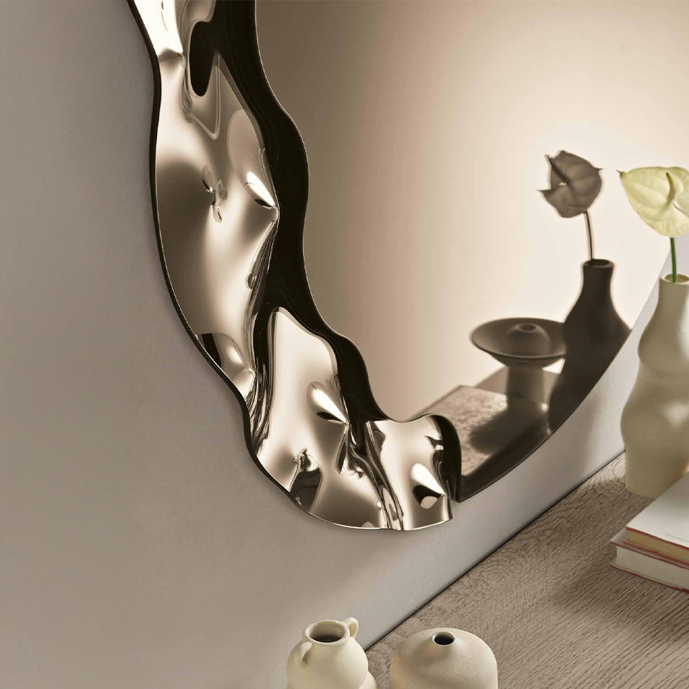 La combinazione tra la parte riflettente e il dettaglio materico permette di inserirlo facilmente in diversi contesti, dalla zona giorno alla camera da letto, come elemento funzionale e decorativo.