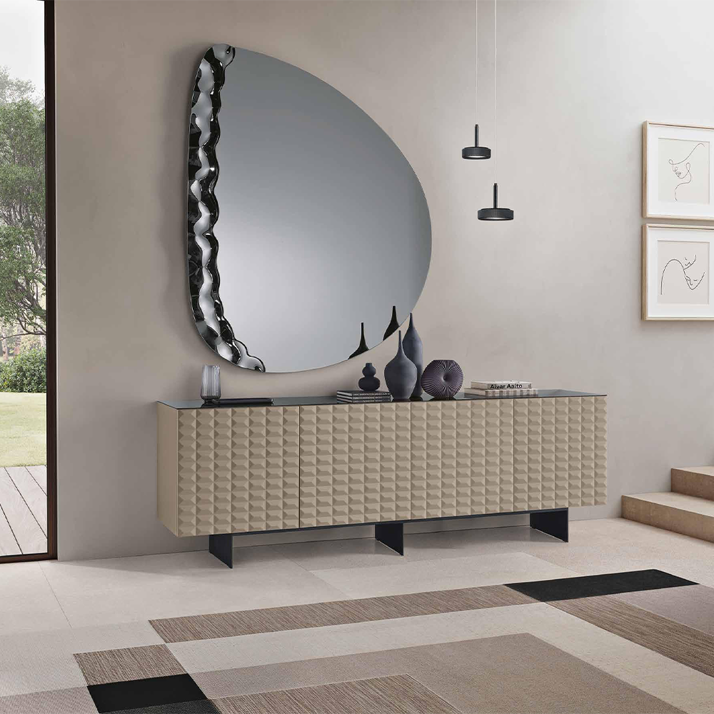 La combinazione tra la parte riflettente e il dettaglio materico permette di inserirlo facilmente in diversi contesti, dalla zona giorno alla camera da letto, come elemento funzionale e decorativo.