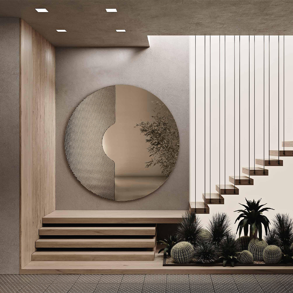 La superficie rotonda, disponibile nelle finiture fumé o bronzo, è arricchita da un inserto laterale a rete che aggiunge profondità e movimento visivo.