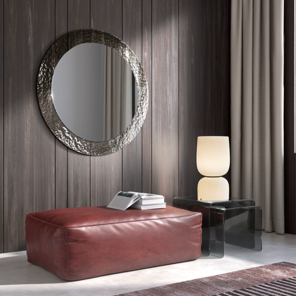 La cornice in vetro cotto, bronzo o fumรฉ, arricchisce lโelemento con un effetto luminoso e sofisticato, mentre la struttura in metallo conferisce soliditร e un tocco contemporaneo.