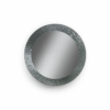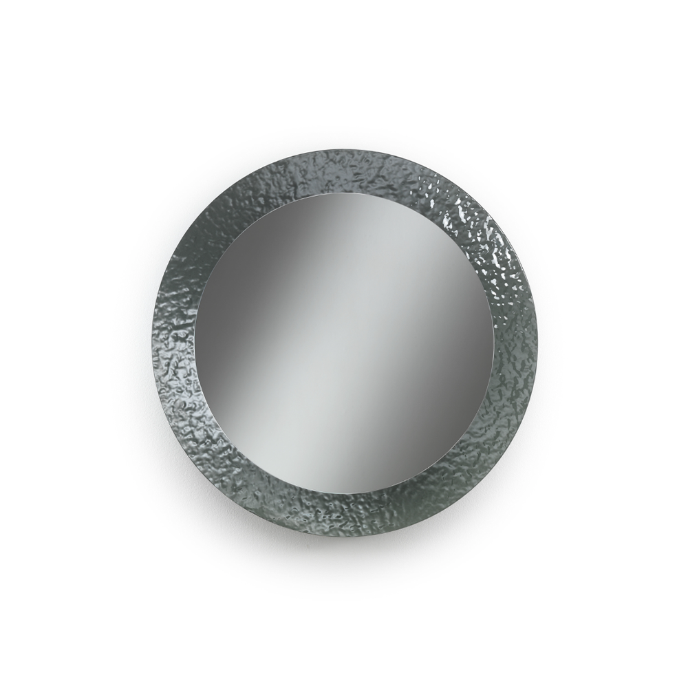 Specchio rotondo con struttura in metallo e cornice in vetro cotto.