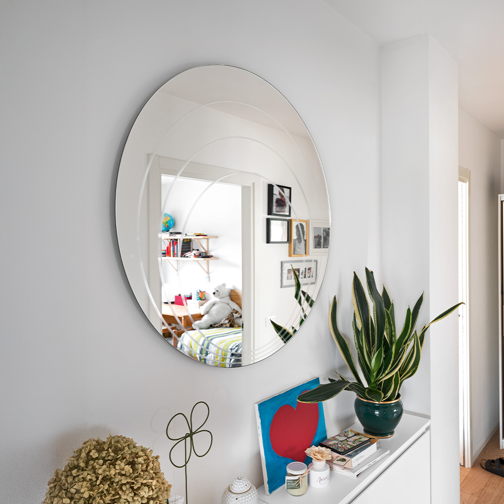 Il disegno inciso dona profonditร e movimento, trasformando lo specchio in un elemento decorativo capace di valorizzare la parete.