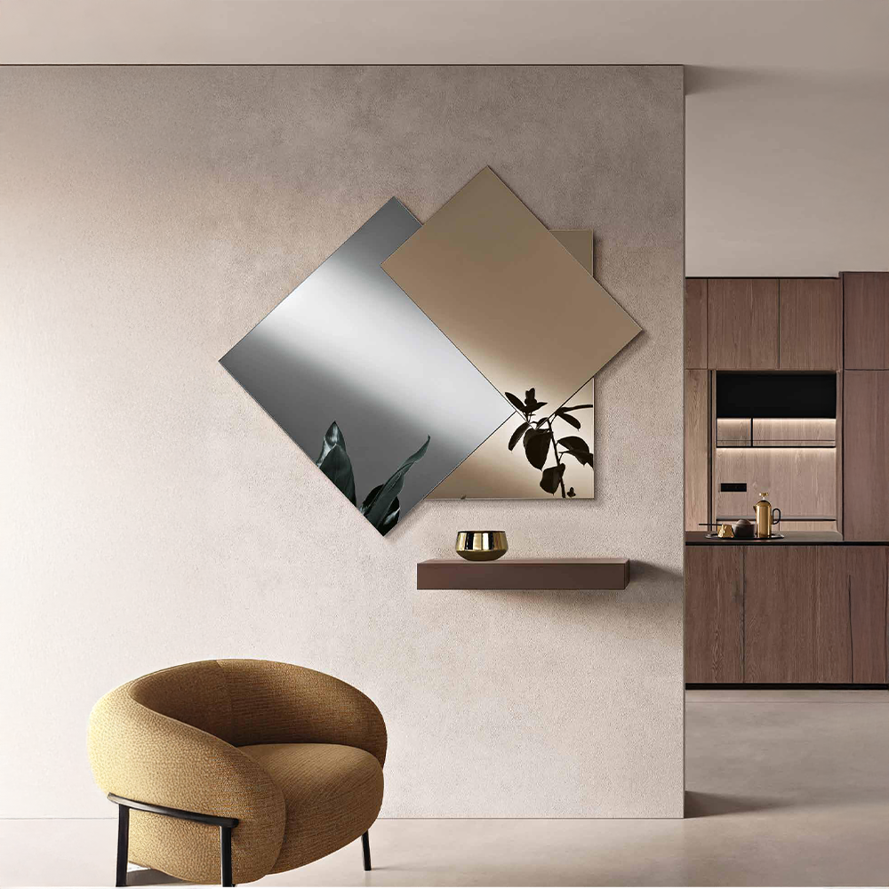 La composizione geometrica conferisce movimento alla parete e dona un tocco contemporaneo allo spazio, rendendo lo specchio facilmente inseribile in ambienti diversi, dalla zona living all’ingresso.