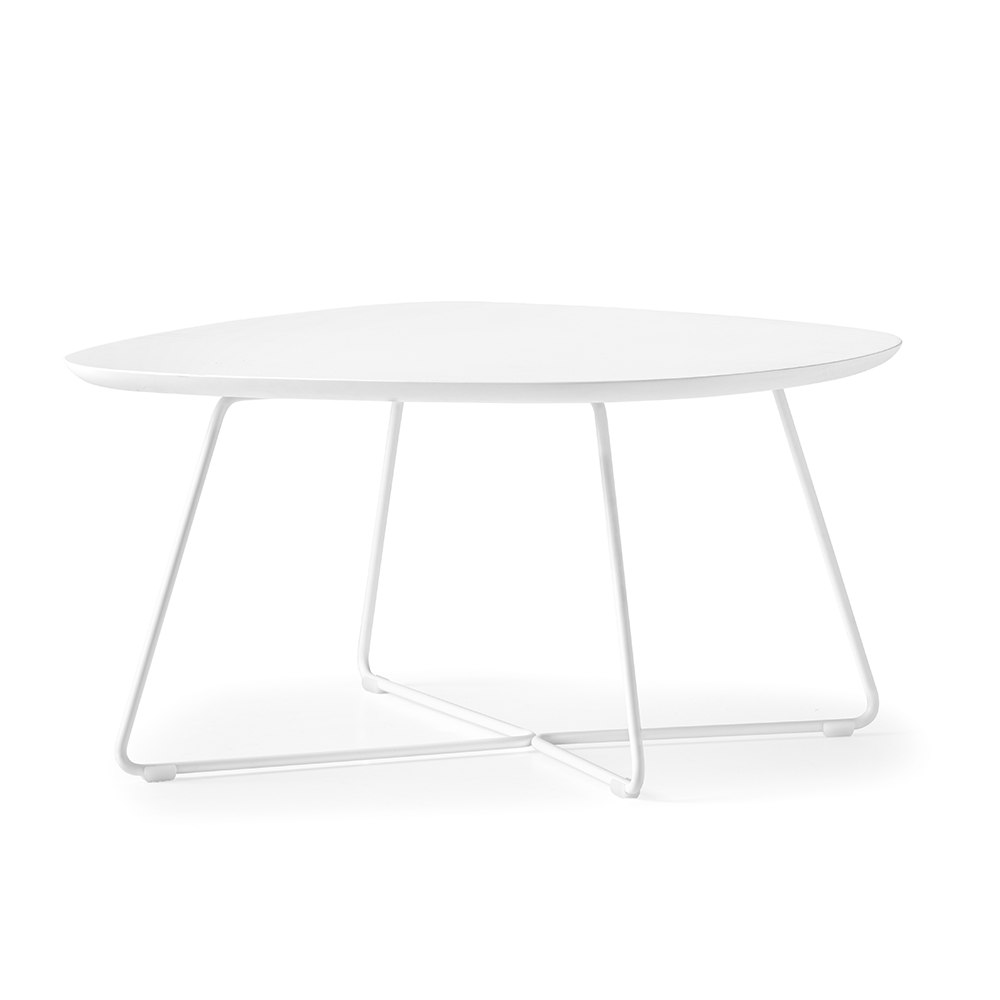 Tavolino triangolare con struttura in metallo e piano in laccato o ceramica su vetro.
