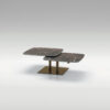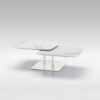 Tavolino da salotto trasformabile con struttura in metallo verniciato e due piani mobili in grès porcellanato con movimento rotatorio di 180° attorno al basamento centrale.