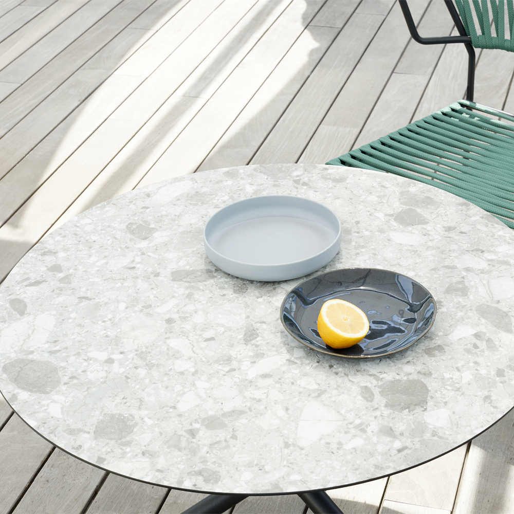 Tavolino con piano rotondo, quadrato o a goccia disponibile in varie finiture e materiali, con basamento a tre piedi in acciaio verniciato. Adatto all’uso interno ed esterno.