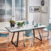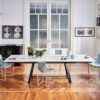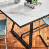 Il suo design semplice gioca sul disegno della base a slitta in metallo che, accostata ai solidi e preziosi piani in legno massello o cristalceramica, diventa una scelta di arredamento originale.