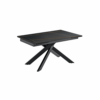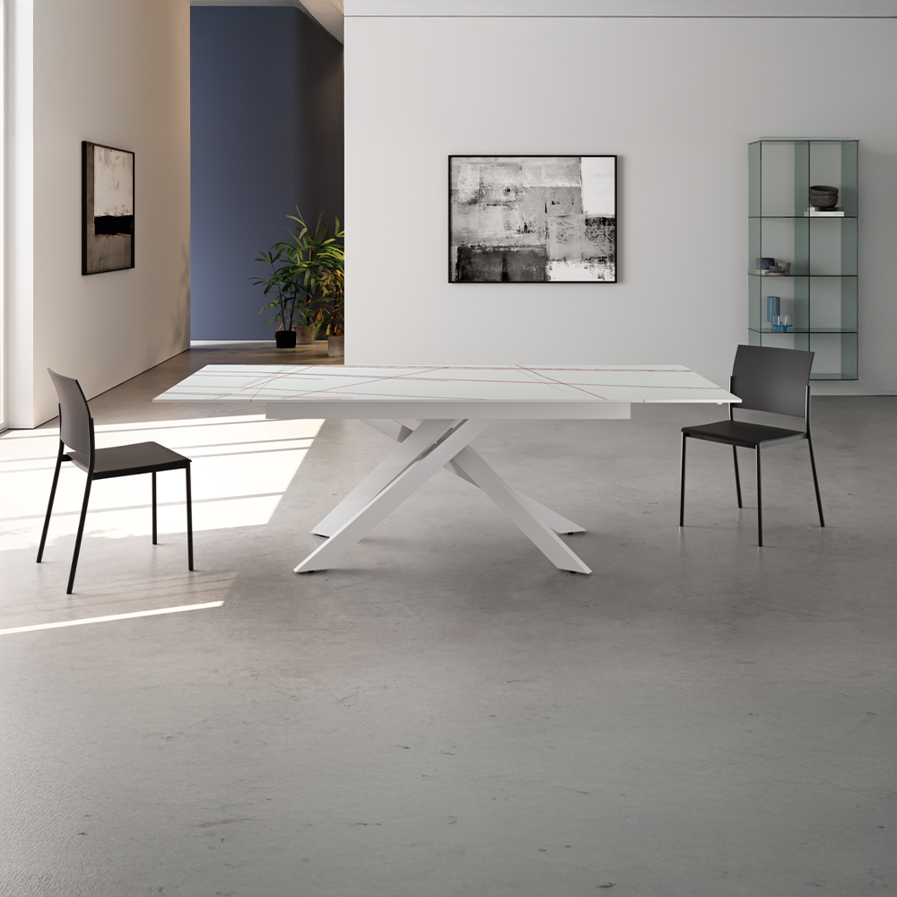 Tavolo allungabile rettangolare con piano in ceramica e base in metallo verniciato.