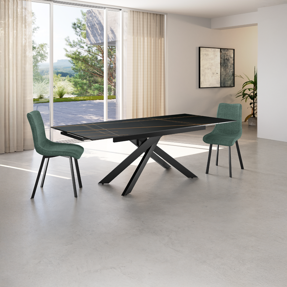 Le gambe in metallo verniciato assicurano stabilitร e un aspetto moderno, mentre le allunghe laterali permettono di accogliere piรน ospiti senza rinunciare alla comoditร .