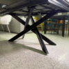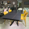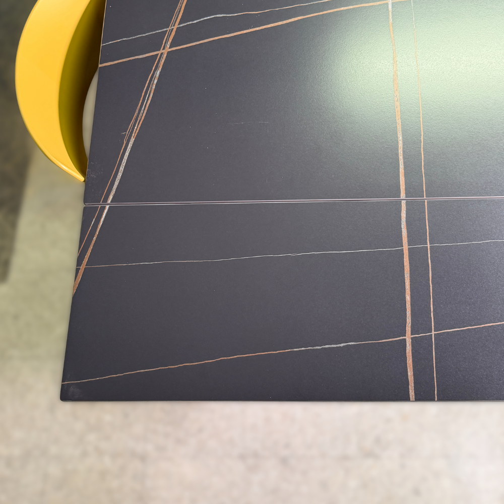 Tavolo allungabile rettangolare con piano in ceramica marmo nero opaco e base in metallo verniciato nero.
