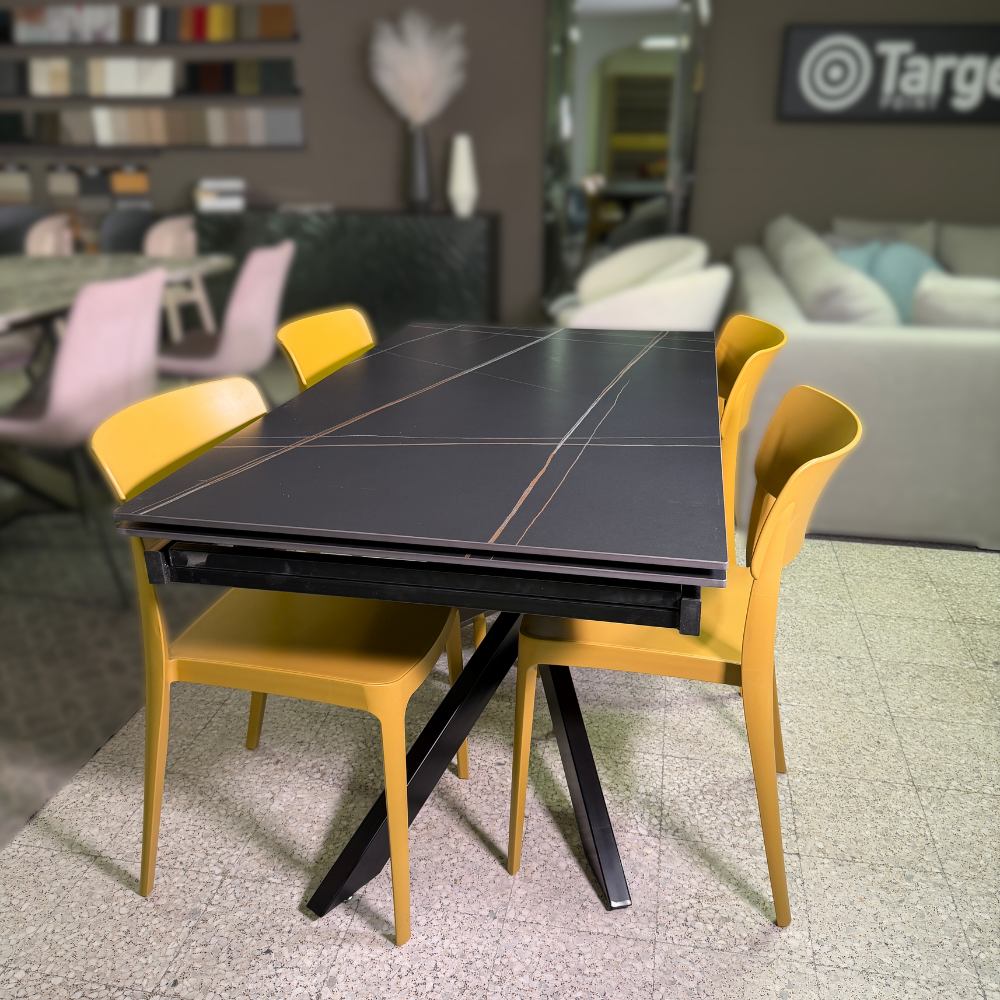 Le gambe in metallo verniciato nero assicurano stabilitร e un aspetto moderno, mentre le allunghe laterali permettono di accogliere piรน ospiti senza rinunciare alla comoditร .
