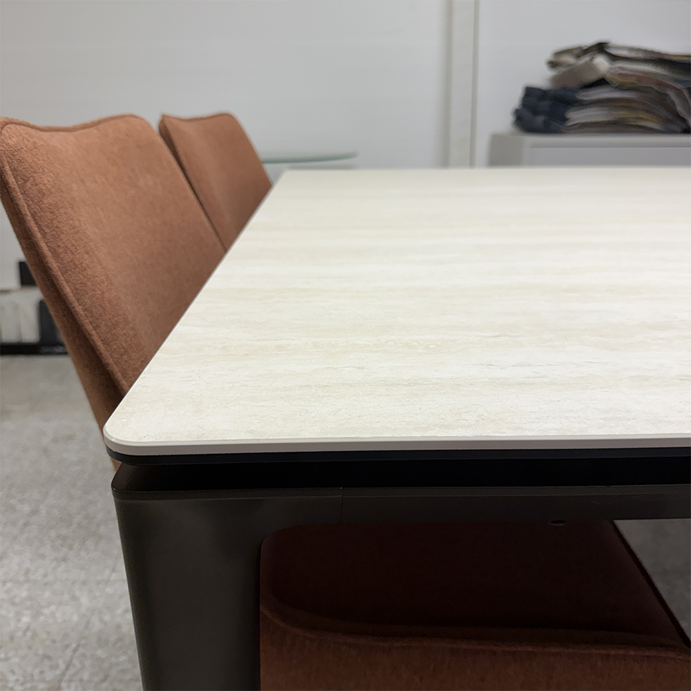La struttura in metallo bronzo garantisce soliditร e un aspetto contemporaneo, mentre il piano in ceramica su vetro travertino bianco opaco dona luminositร e un piacevole effetto materico.