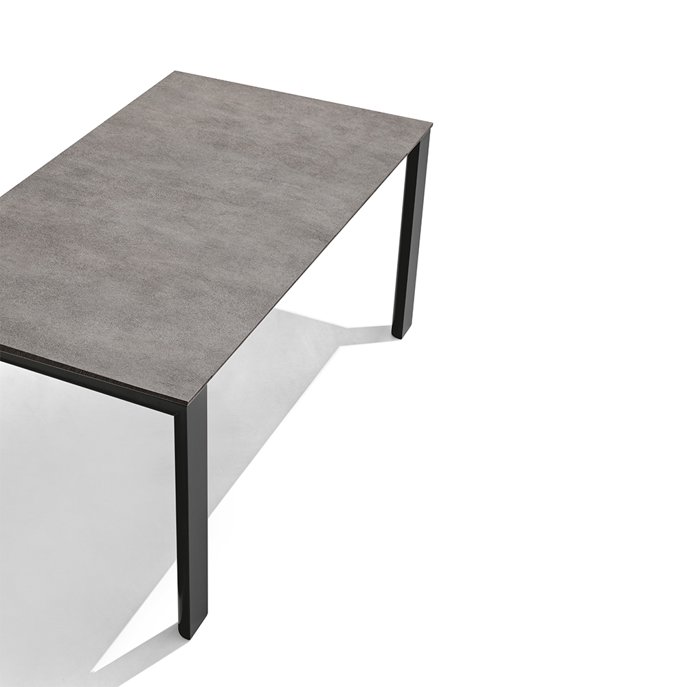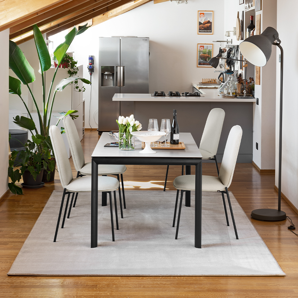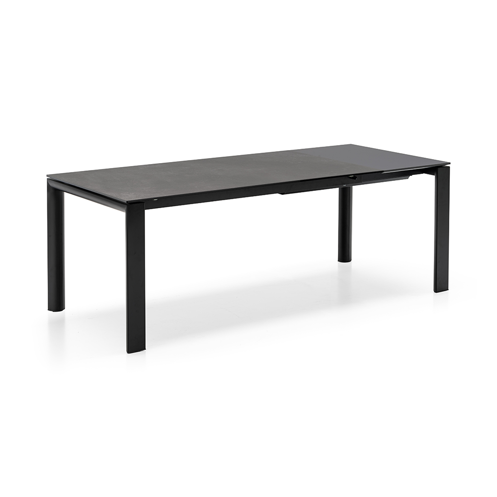 Tavolo allungabile rettangolare con struttura in metallo e piano in nobilitato o ceramica su vetro.