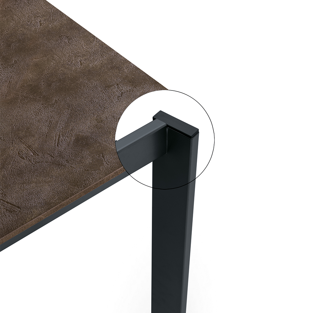 Il piano rettangolare รจ disponibile in nobilitato oppure in ceramica su vetro, cosรฌ da soddisfare differenti esigenze di stile e praticitร .