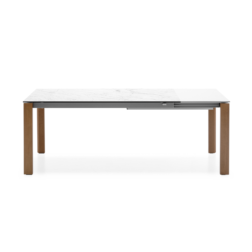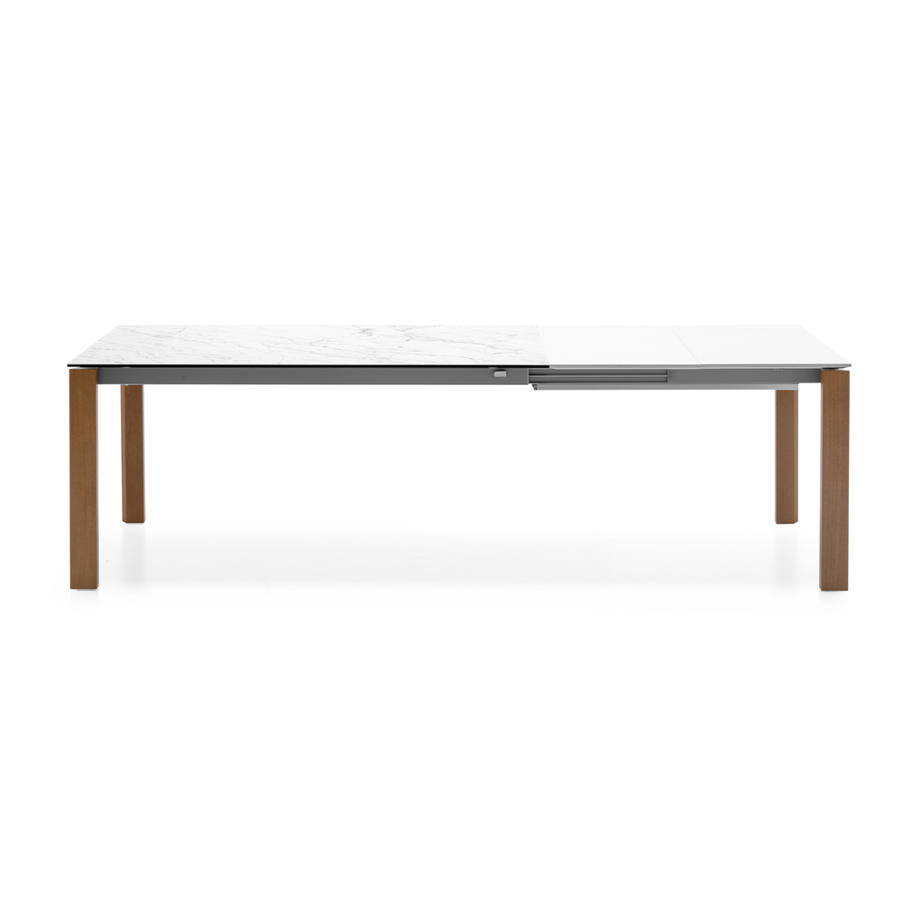 Tavolo allungabile rettangolare con struttura in legno di faggio o frassino e piano in nobilitato o ceramica su vetro.
