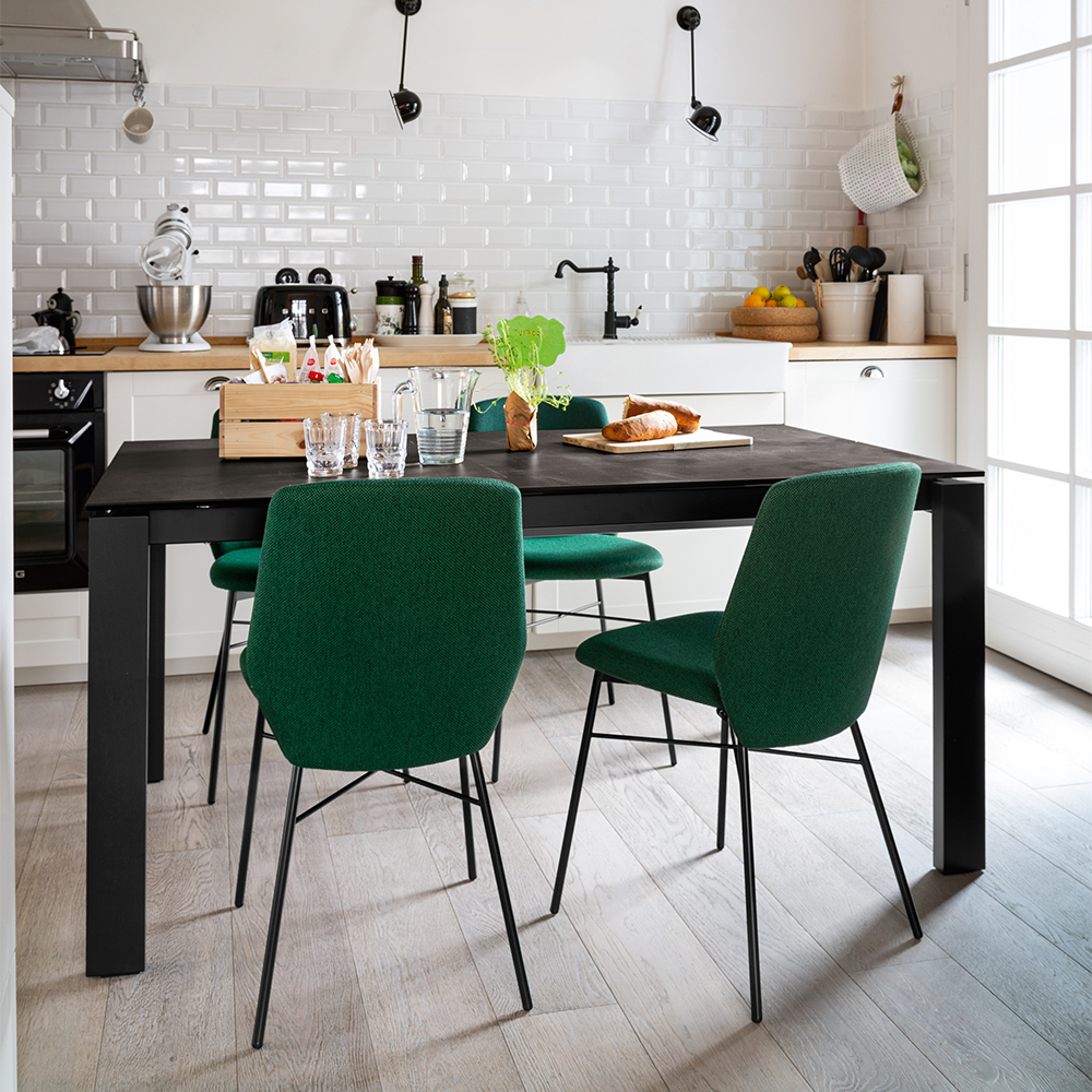 Il piano rettangolare รจ disponibile in nobilitato oppure in ceramica su vetro, nella versione con 1 o 2 allunghe, mentre nella versione con 3 allunghe รจ disponibile solo in nobilitato, cosรฌ da soddisfare differenti esigenze di stile e praticitร .