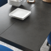 L’allunga a libro è realizzata nello stesso materiale e colore del piano, garantendo uniformità estetica anche quando il tavolo è aperto.