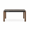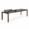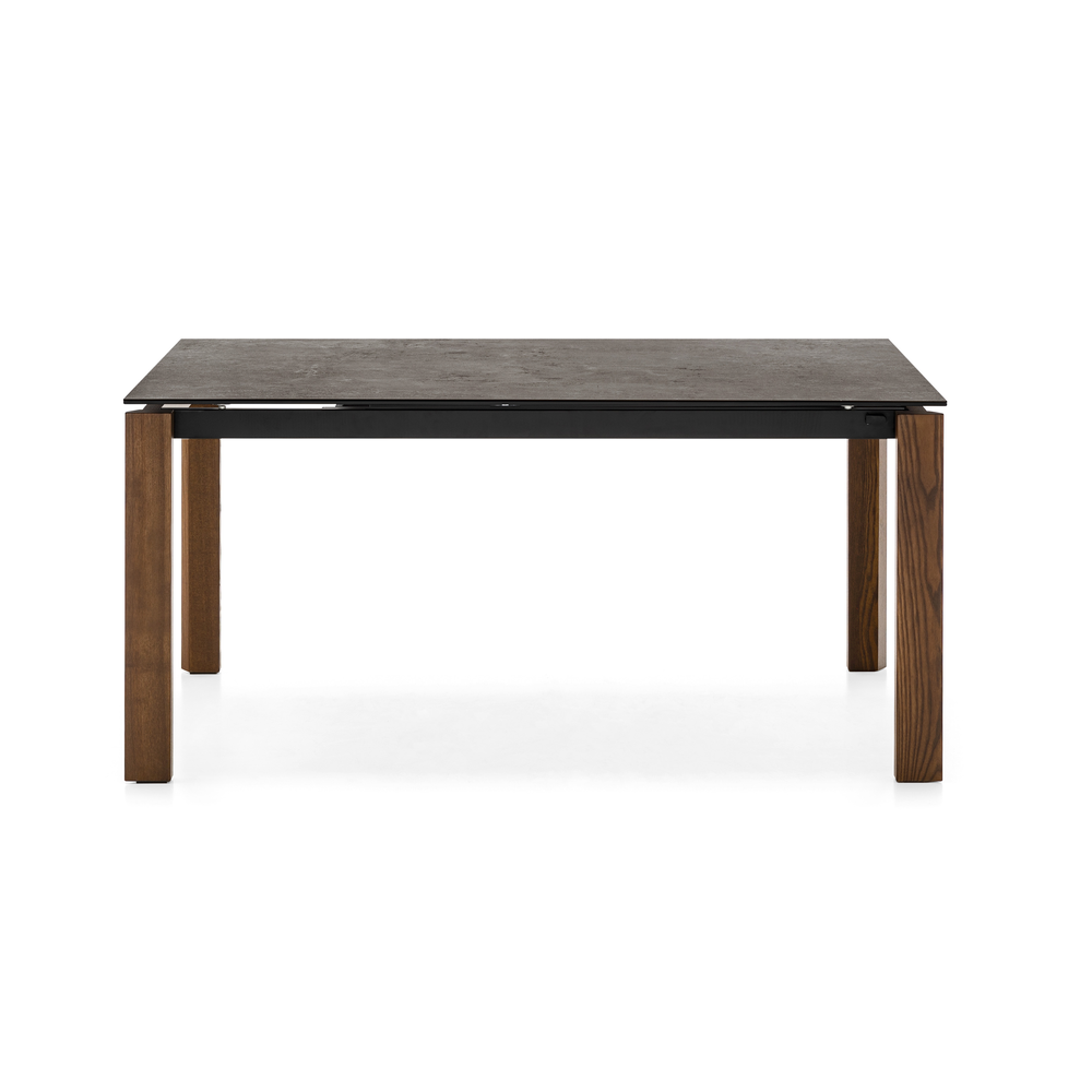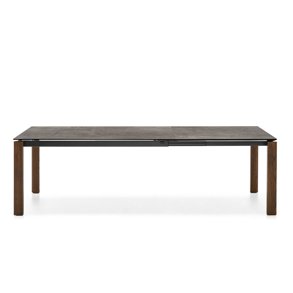 Tavolo allungabile rettangolare con struttura in legno di faggio o frassino e piano in ceramica su vetro.