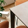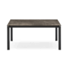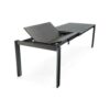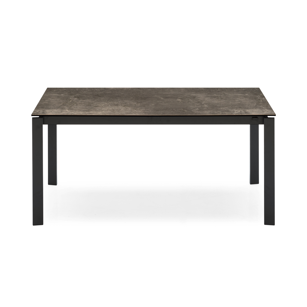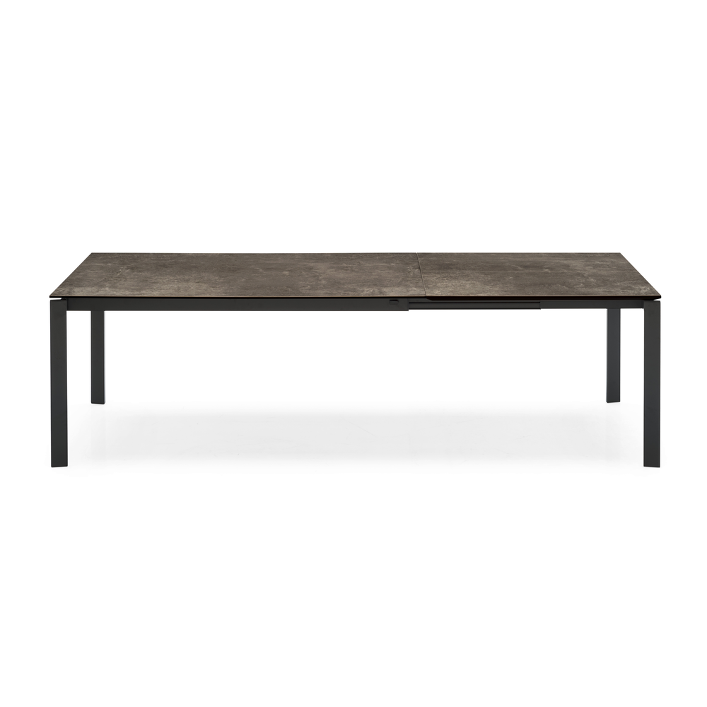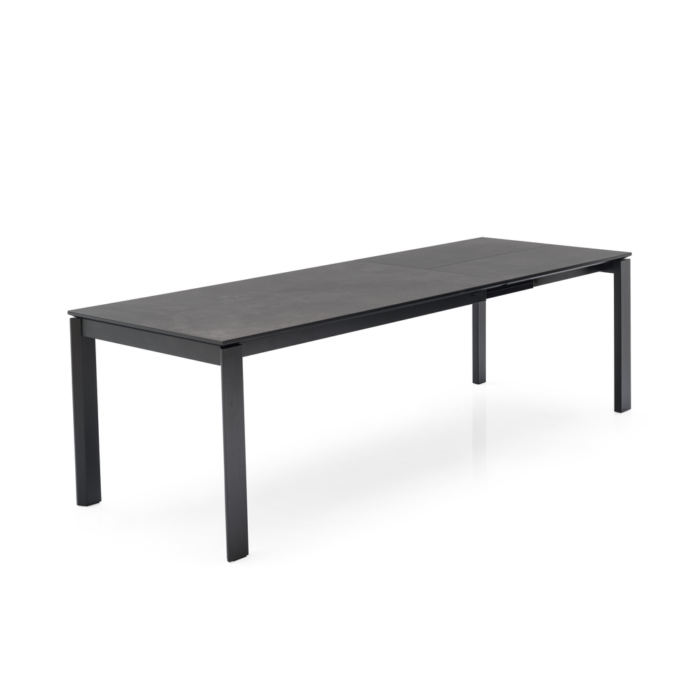 Tavolo allungabile rettangolare con struttura in metallo e piano in ceramica su vetro.