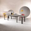 Tavolo allungabile rettangolare con base in metallo e piano in legno o cemento.