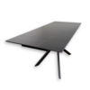 Tavolo allungabile rettangolare con base in metallo verniciato nero e piano in marmo nero opaco.