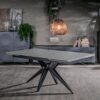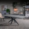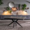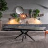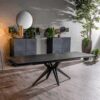 Tavolo allungabile rettangolare con top in ceramica e base in metallo verniciato.