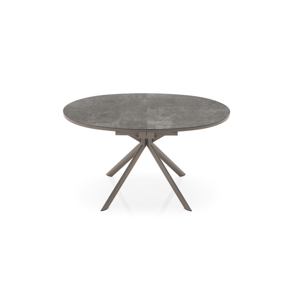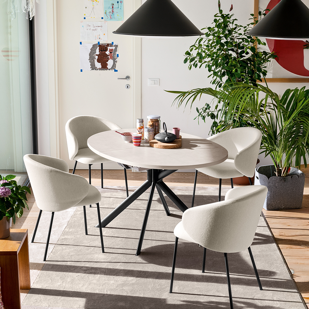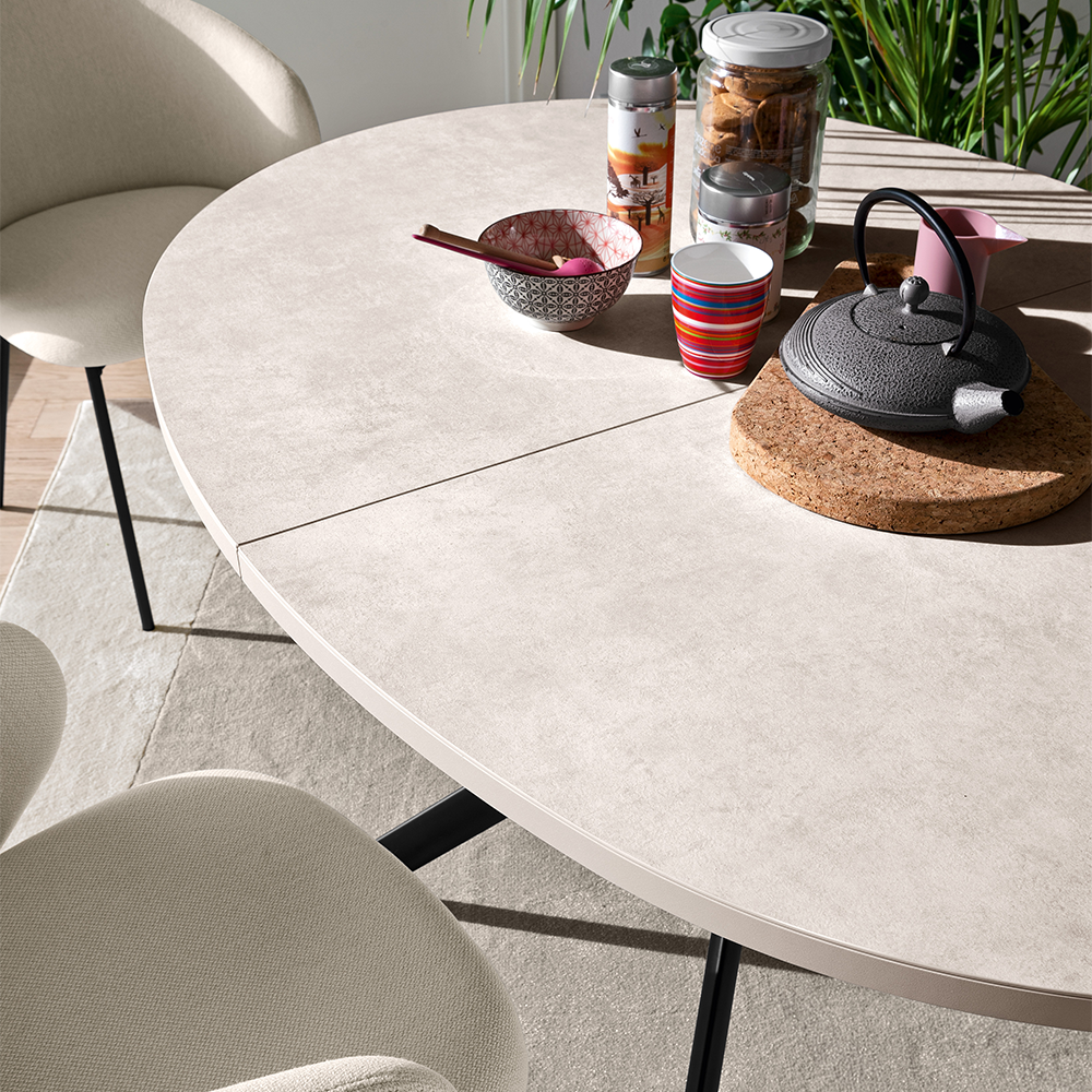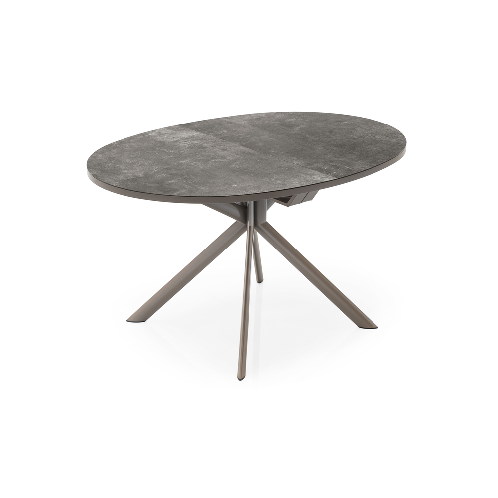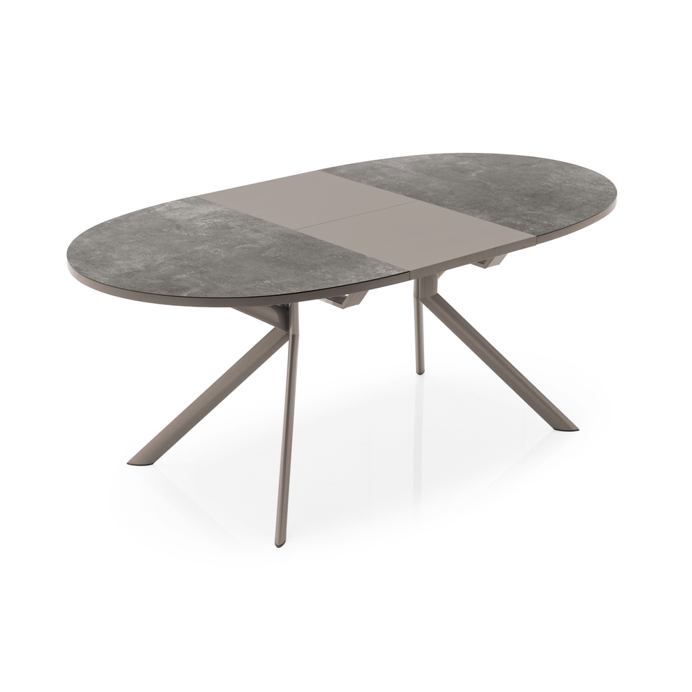 Tavolo allungabile ovale con struttura in metallo e piano in nobilitato, vetro temperato o ceramica.