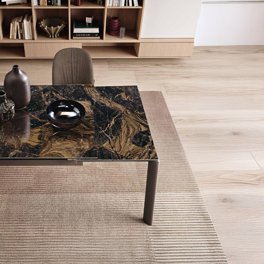 Il tavolo allungabile rettangolare Frost presenta una struttura in metallo verniciato abbinata a un piano in grès porcellanato effetto marmo, disponibile in diverse varianti.