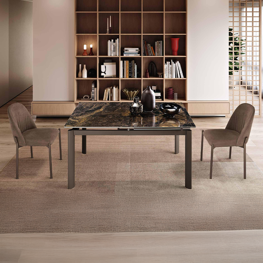 Tavolo allungabile rettangolare con struttura in metallo verniciato e piano in grès porcellanato effetto marmo.