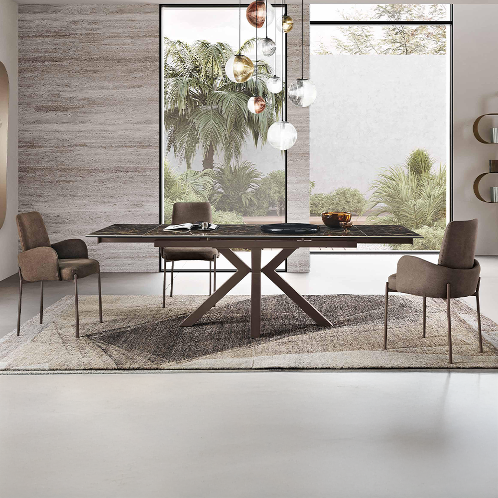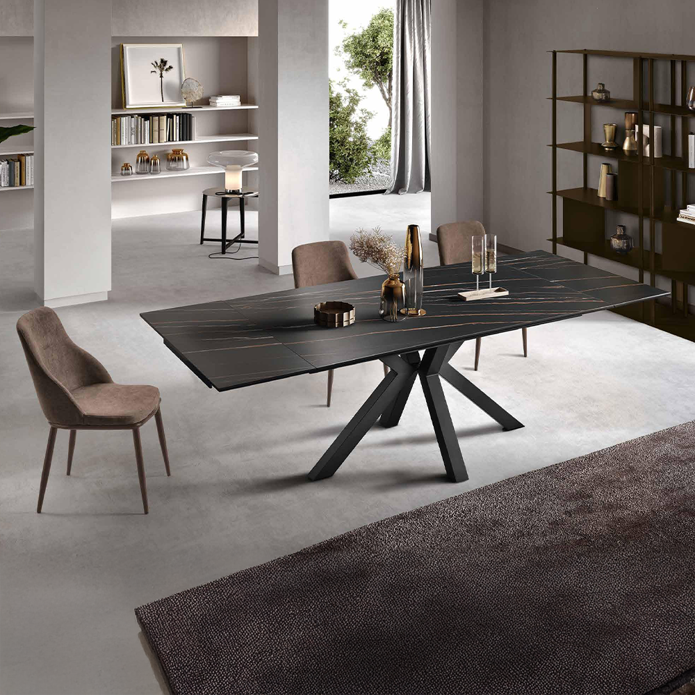 Tavolo allungabile rettangolare con base in metallo verniciato e piano in grès porcellanato effetto marmo.