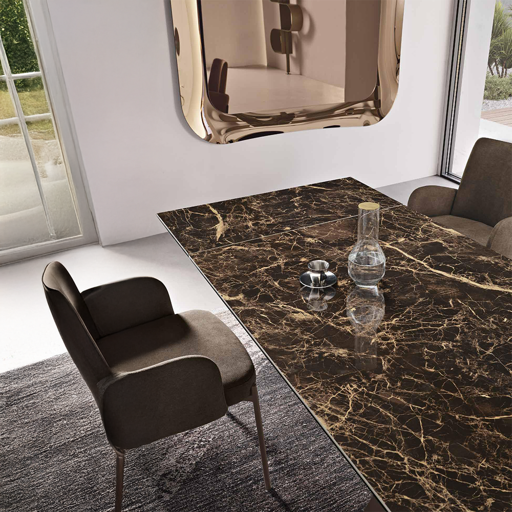 Il tavolo rettangolare allungabile Jacky unisce praticità e stile grazie al piano in grès porcellanato effetto marmo.