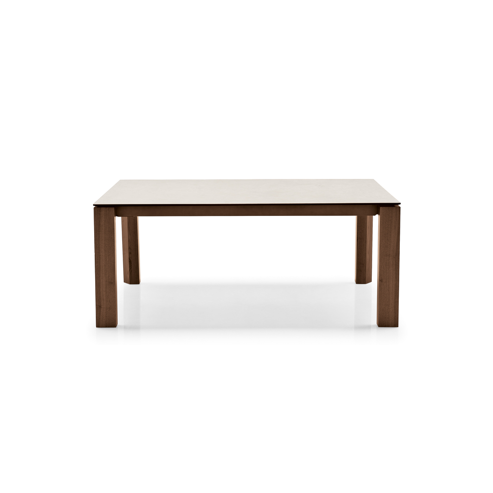 La struttura in impiallacciato sostiene un piano rettangolare in ceramica su vetro, una soluzione che unisce resistenza e facilitร di manutenzione.