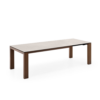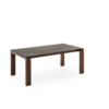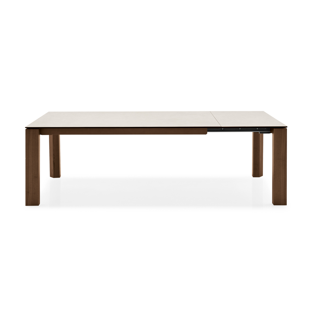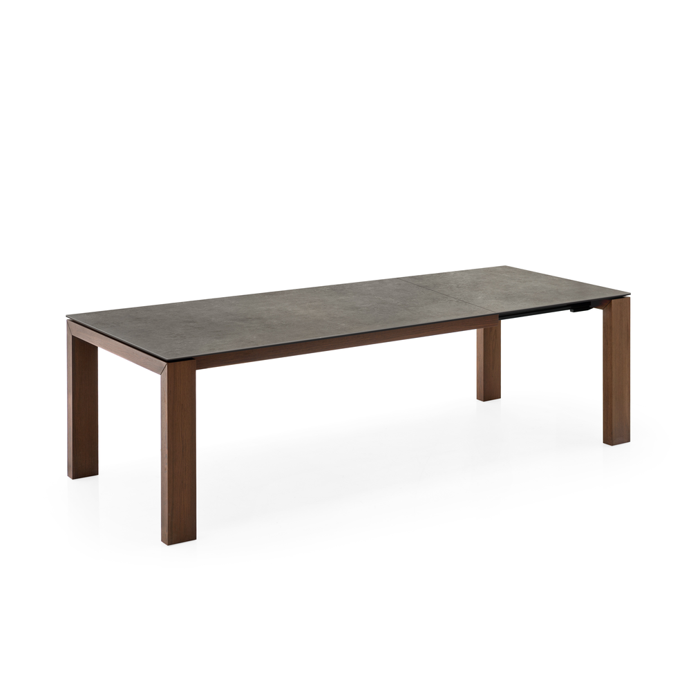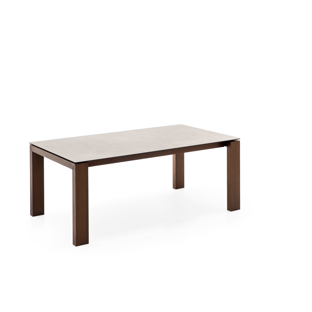 Tavolo allungabile rettangolare con struttura in impiallacciato e piano in ceramica su vetro.