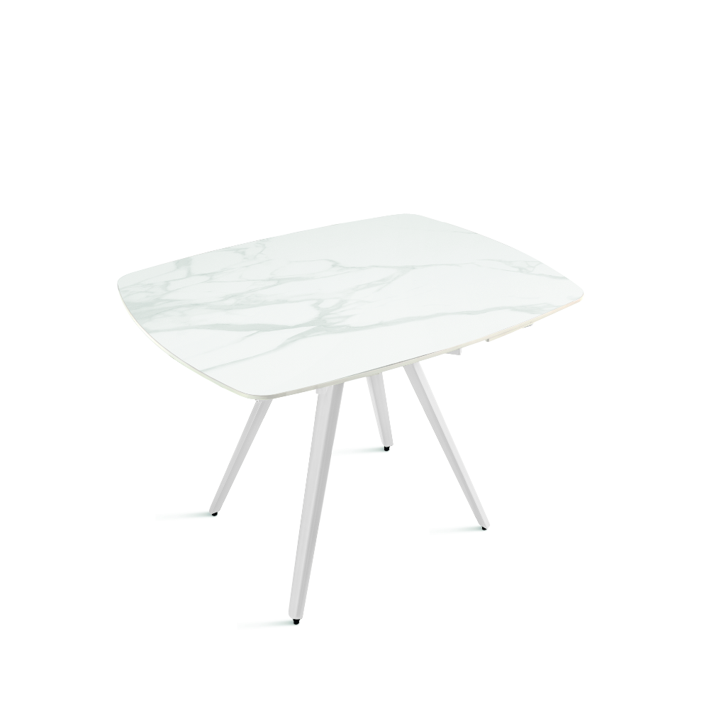 Tavolo allungabile a botticella con piano in pietra sinterizzata effetto marmo bianco lucido e base in metallo verniciato bianco.