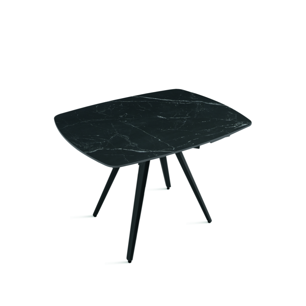 Tavolo allungabile a botticella con piano in pietra sinterizzata effetto marmo nero opaco e base in metallo verniciato nero.