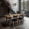 Tavolo allungabile rettangolare con piano in frassino tinta naturale e gambe a U in ferro antracite.
