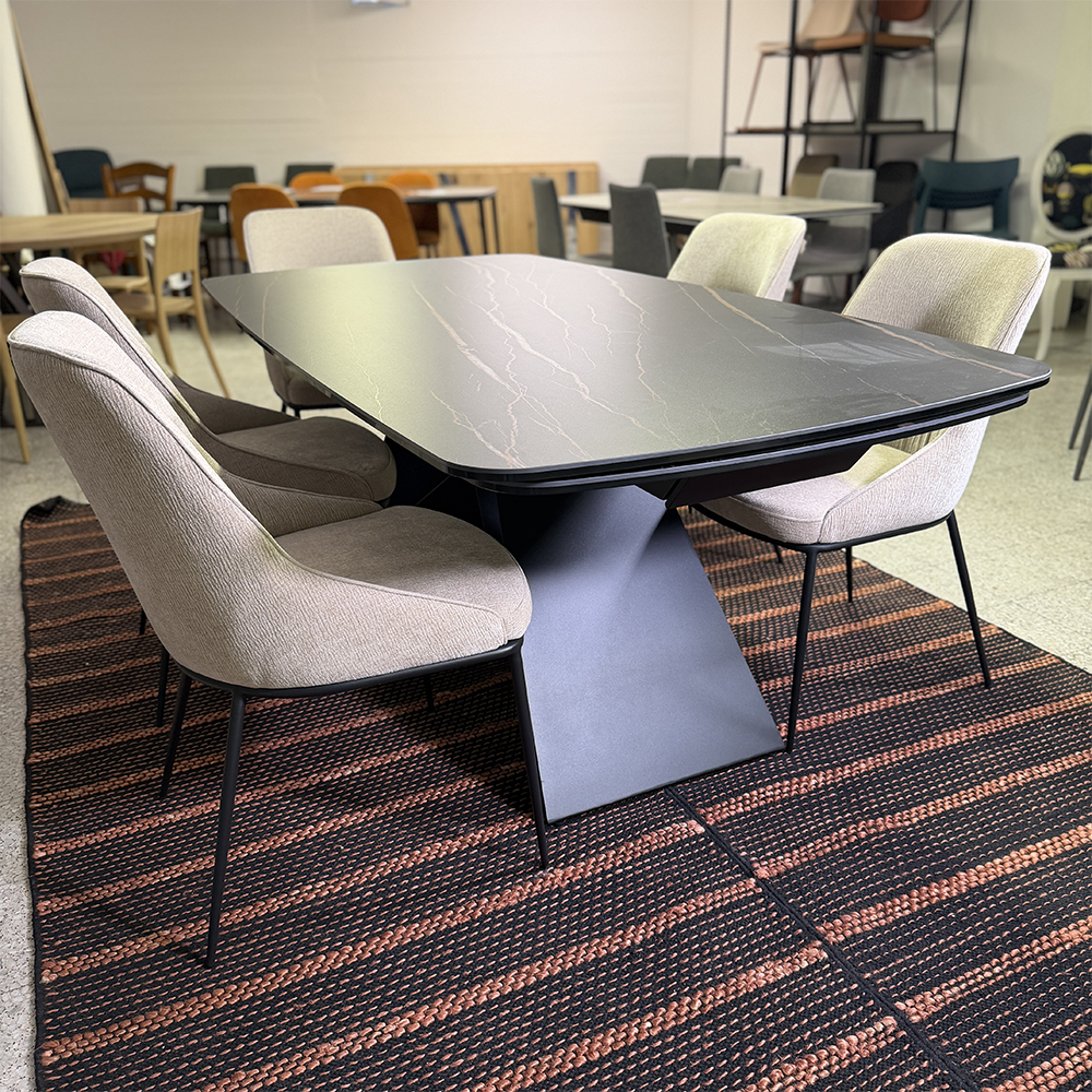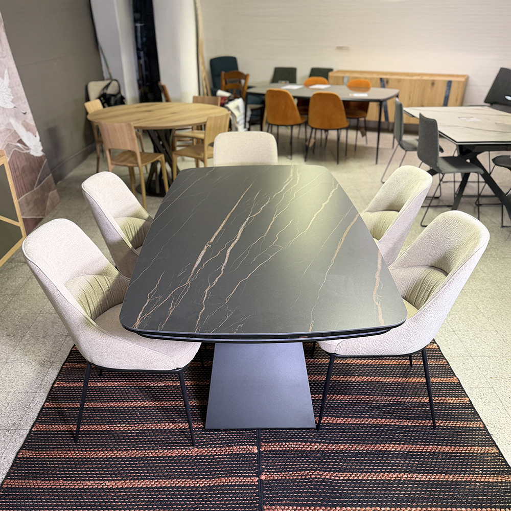 La base in metallo nero assicura stabilitร e dona un tocco contemporaneo al design del tavolo.