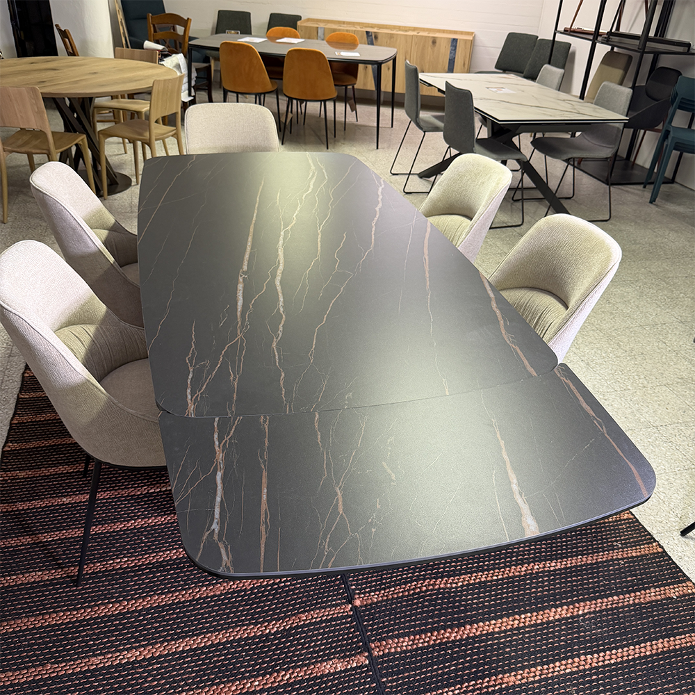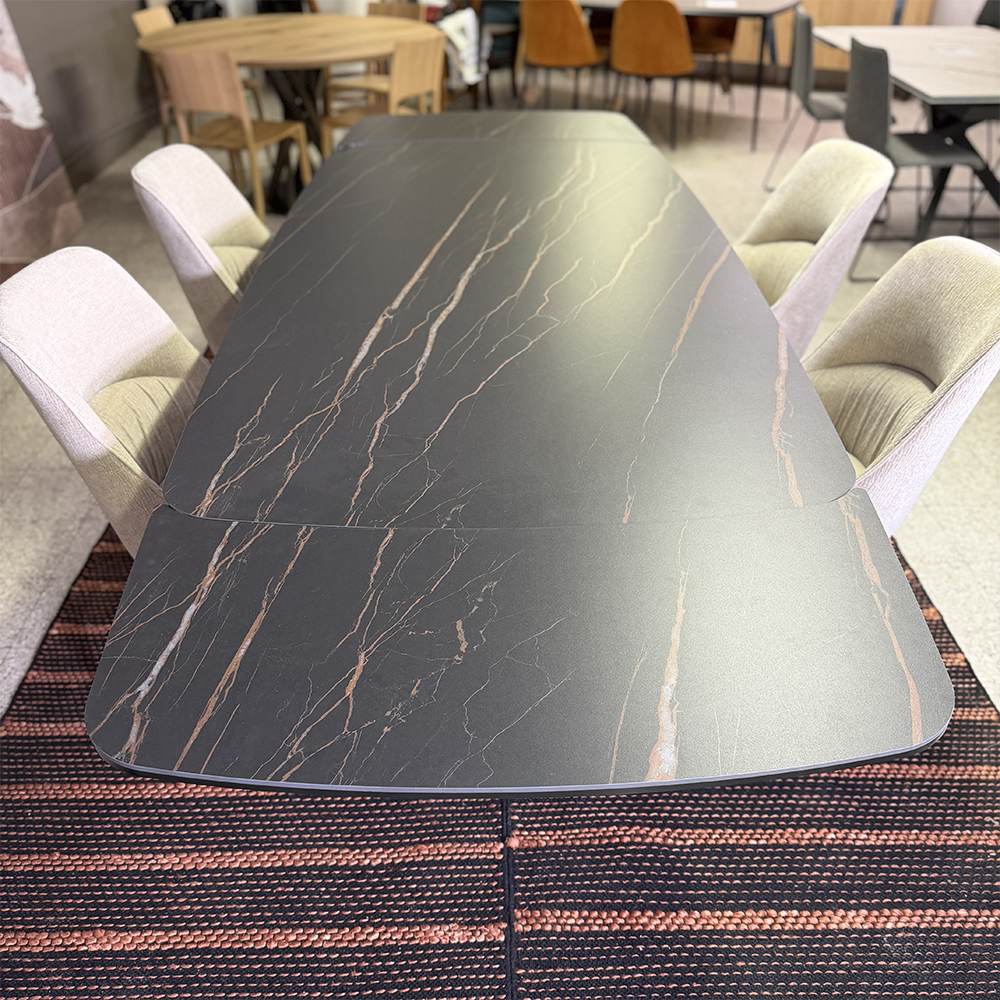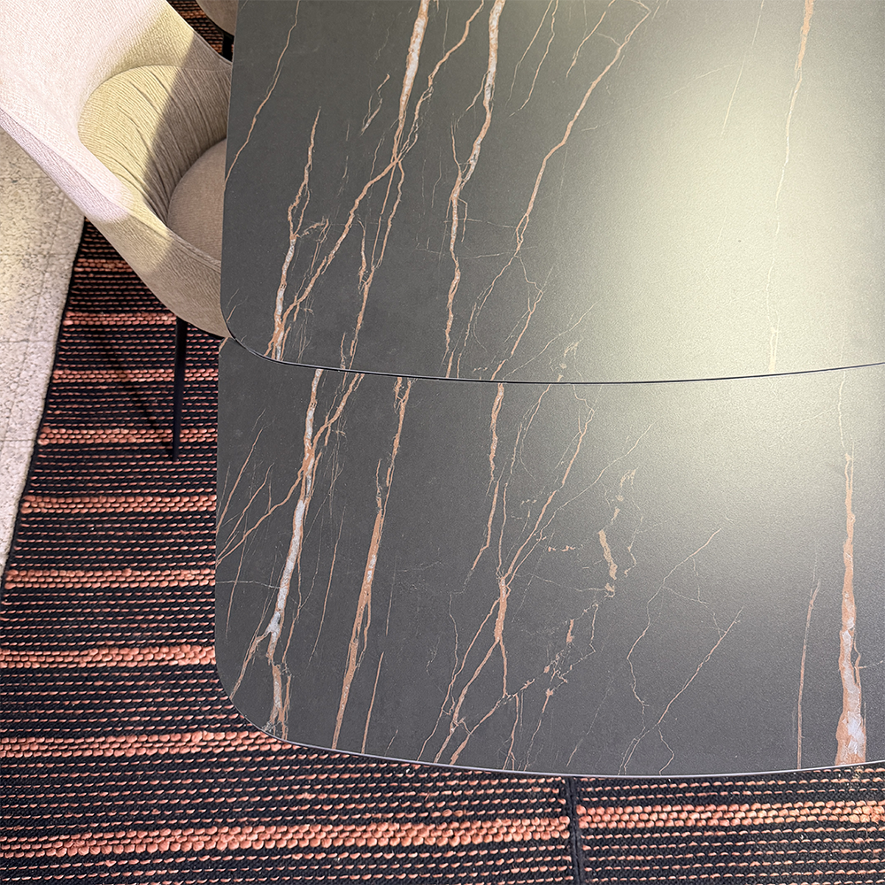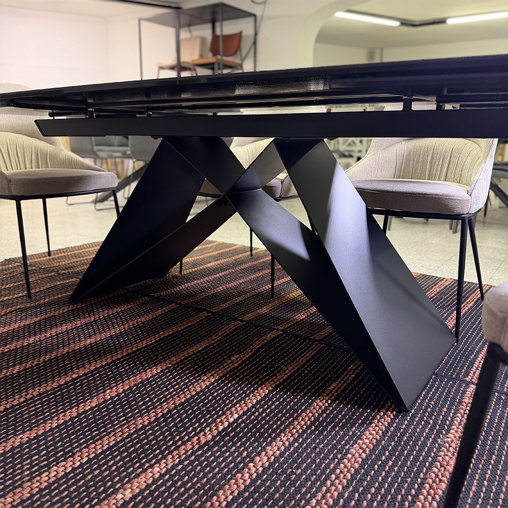 Tavolo allungabile rettangolare con struttura in metallo nero e piano in ceramica su vetro temperato marmo nero portoro.