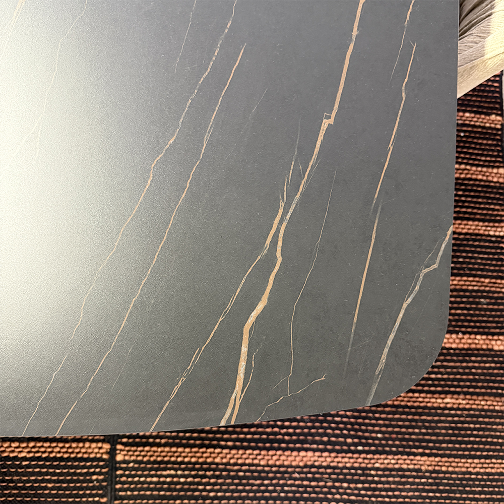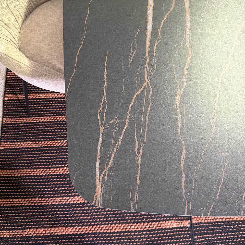 Il top rettangolare รจ realizzato in ceramica su vetro temperato, un materiale resistente e facile da pulire, disponibile in marmo nero portoro, per adattarsi a diversi ambienti e preferenze estetiche.